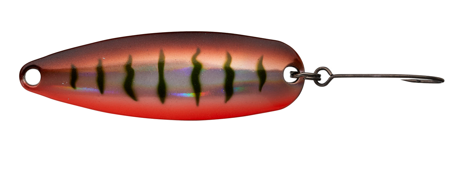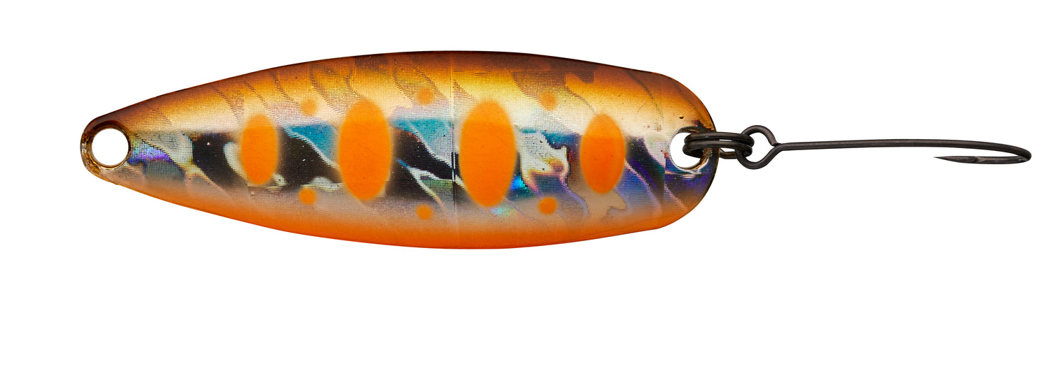La cuiller ondulante NATIVE SPOON se caractérise par une nage à large débattement et à forte amplitude. À la descente, elle oscille avec un rolling prononcé capable de provoquer à lui seul l’attaque d’une truite postée le long d’une berge ou sous un obstacle immergé, à condition de présenter le leurre au plus près de la structure.