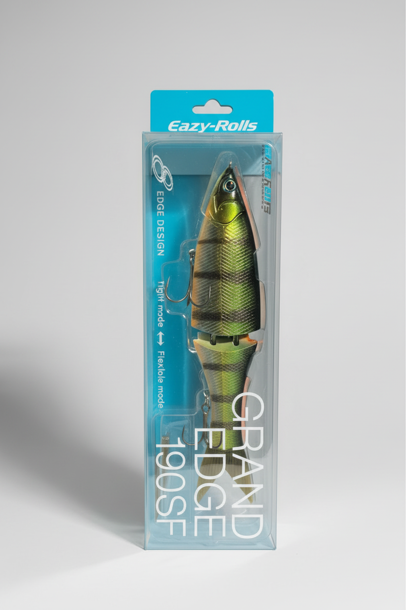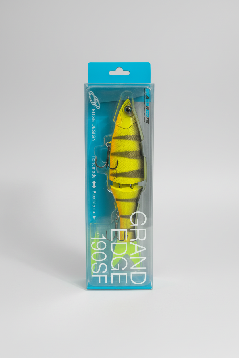 Le swimbait Grand Edge 190SF de Grassroots est une petite merveille de développement! Sa particularité réside dans 2 points essentiels qui le singularisent. D'une part les canaux creusés dans le ventre et dans le dos pour "guider" le flux d'eau et limiter un rolling excessif. Et d'autre part l'articulation qui peut être réglée de 2 façons bien distinctes. En choisissant l'articulation lâche on obtient un leurre qui fait des virages francs, une nage assez saccadée. Au contraire en rapprochant les 2 sections on obtient une nage en S lente très caractéristique des swims. Equipé de triples Decoy Y-F33F.